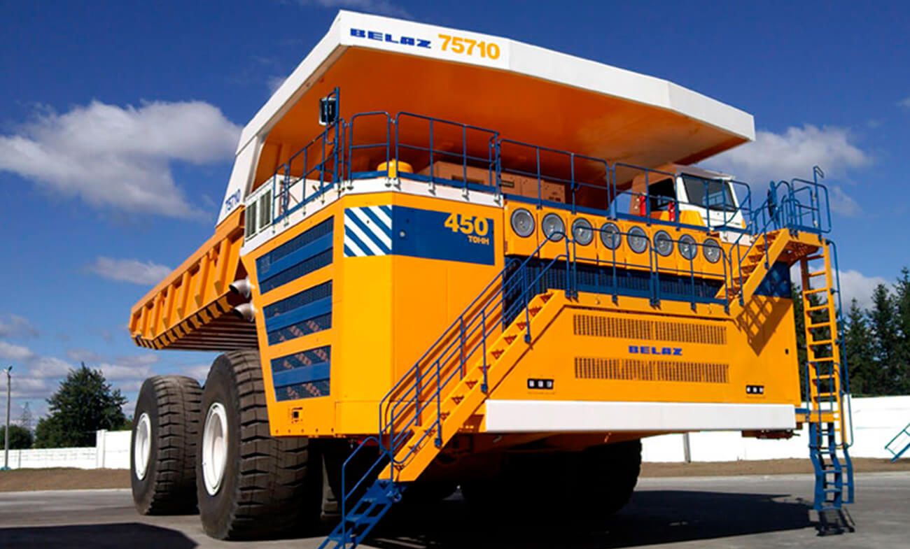 El BelAZ 75710 supera a todos sus rivales en capacidad de carga. En la minería a cielo abierto, su capacidad de carga y la eficiencia energética son los valores más importantes. Con 450 toneladas de capacidad de carga y un bajo consumo proporcional de combustible, este monstruo de la minería mide 20,6 metros de largo, 9,87 metros de ancho y 8,17 metros de alto. Cuenta con un peso máximo es de 810 toneladas y que descansa sobre ocho neumáticos de cuatro metros de altura.